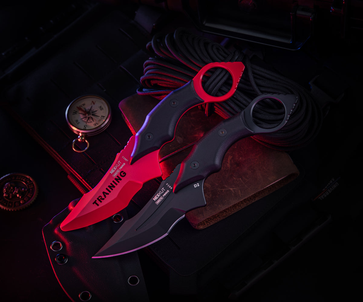 Designed by Royce Ramos, the NEXKUT NMD76 is a dual-knife set built for combat and professional training. Featuring a live blade and a red-edged trainer, it’s made for both real-world use and instructional demonstrations. With dual finger rings, a reinforced 3.25-inch blade, and an ergonomic grip, Fierce delivers speed, control, and mission-ready reliability.